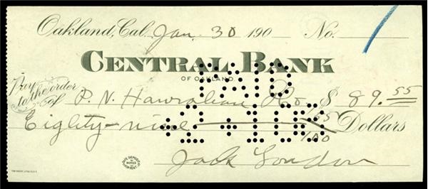 Signed check from the great American author who wrote Call of the Wild and White Fang. Dated Jan. 30, 1908, check in the amount of $89 is made out and signed in black fountain pen. EX.