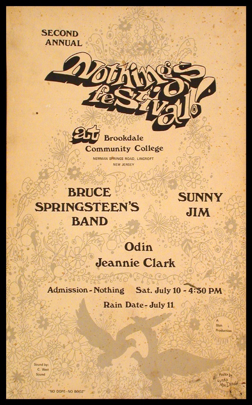 The Second Annual Nothings Festival is really the first because the First never happened. So why didn’t they call the Second the First? The Second Annual Nothings Festival was held at Brookdale Community College on July 10, 1971 and advertises “Bruce Springsteen’s Band”. Admission is nothing, and poster says “No Dope – No Booz”. 14x22”, EX.