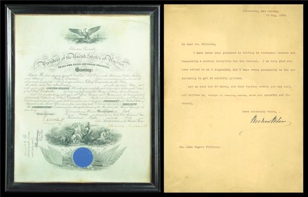 In a typed letter to author-historian, John Rogers Williams, Wilson wishes his associate, “every prosperity to the undertaking to get it [his “Journal”] worthily printed”. Dated, “19 May, 1899”, the letter continues on, “Let me here how it fares, and what further advice you may need”. Signed in strong black fountain pen (8/10). The lightly toned paper includes its original mailing folds along with light creasing o/w EX. The appointment certificate, complete with blue “Navy Department” seal, is decorated with Americana graphics. Roosevelt’s 7.5/10 black fountain pen signing is fluent though lightly faded and the certificate displays some wrinkling and light staining but o/w EX. Framed to 17”x21”.