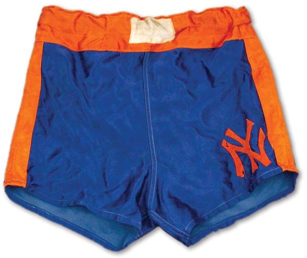 When Sugar Ray Robinson retired from professional boxing in 1965 he was honored at New York's Madison Square Garden and given a trophy that summed up his contribution to the sport with the simple inscription, "Sugar Ray Robinson The Greatest Fighter Who Ever Lived." Robinson's professional career spanned twenty-five years. He finished with a record of 175-19-6 with one no decision and one no contest. 109 of his victories were by KO. His first title was as World Welterweight Champion. He won the World Middleweight Title 5 times. His victims included Hall of Famers, Carmen Basilio, Bobo Olson, Gene Fullmer, Jake LaMotta and Kid Gavilion. Overshadowed by his professional accomplishments is the incredible career Robinson had as an amateur fighter. He won the Golden Gloves in 1939 as a featherweight and in 1940 as a lightweight. He competed in 85 amateur bouts winning 69 by KO and 40 of those in the very first round. Lelands is proud to offer a pair of trunks used by Sugar Ray Robinson during his amateur career in the Gold Gloves. These incredible trunks are blue satin with orange trim. On the lower left leg is the orange embroidered "NY" insignia of the NY Gold Gloves. Label on the waistband for manufacturer, "Davega" is faded, but readable. There are some small holes in the "NY" on the leg and the trunks do exhibit wear, but are perfectly intact. These trunks came from the family of Sugar Ray Robinson. These were kept by his wife Edna Mae Robinson and passed on to their son, Ray Robinson II. Ray Robinson II has provided a detailed accompanying LOA for the trunks. Trunks are true museum quality. An extremely rare opportunity to purchase documented fight worn trunks from the man always remembered as "Sugar Ray."