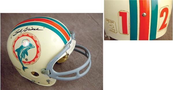 Wilson helmet was worn by Bob Griese during his playing days with the Miami Dolphins. Dolphins team logo affixed to either side of helmet. Signed on top in black sharpie. Griese's #"12" affixed onto back. Size "7 1/8 - 7 1/4" marked in gold on the right side. Emblems and inner padding are all original. The padding's velcro straps have separated from the lining of the helmet, but all there. Helmet shows good use and is toned to a slightly off-white color. LOA. One of the more important leaders and influences in modern football.