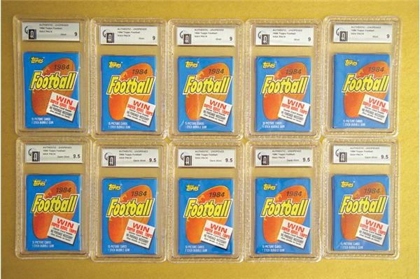 One hundred 1984 Topps football wax packs all authenticated by GAI, Global Authentication. Ninety-five of them grade GAI 9 Mint and the other five grade GAI 9.5 Gem Mint. Keep these closed for investment or look for rookies of Dan Marino, John Elway, Eric Dickerson, and Howie Long. GAI's pack holders are perfect for the long-term investment of unopened material.