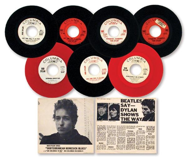 A collector's dream! Important collection of 45's from Dylan, highlighted by his most rare and sought after sleeve, surpassing "Blowing of the Wind" for scarcity and desirability - "Subterranean Homesick Blues." The back of the sleeve features reprint of an article from Jan. 9, 1965 edition of Melody Maker magazine (UK). The headline declares, "Beatles say - Dylan shows the way." 2. Three copies of Dylan's "Blowin' in the Wind / Don't Think Twice It's All Right." First is orange label Columbia stock copy that was for sale at the time of its release. Second is white label promo with red print. Third is a very rare white label promo with black print, that has notation at the bottom, "Special Album Excerpt." This trio makes this lot irresistable! 3. "Mixed Up Confusion / Corrina Corrina" - historic first recording by Dylan for Columbia Records which went nowhere. All unsold copies pressed were actually melted down and used for other Columbia Records pressings. This copy is VG/VG and still retains some of the original gloss on the vinyl. "Corrina Corrina" side sports a "for demonstration use only, not for sale" sticker. 4. "Positively 4th Street" red wax W.L. promo.