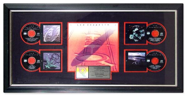 RIAA certified platinum award for Led Zeppelin's 1990 released boxed set "presented to Atlantic Records to commemorate the sale of more than 500,000 units of the album, cassette and C.D." Award display features the cover artwork and the four CD's in the set. NRMT.
