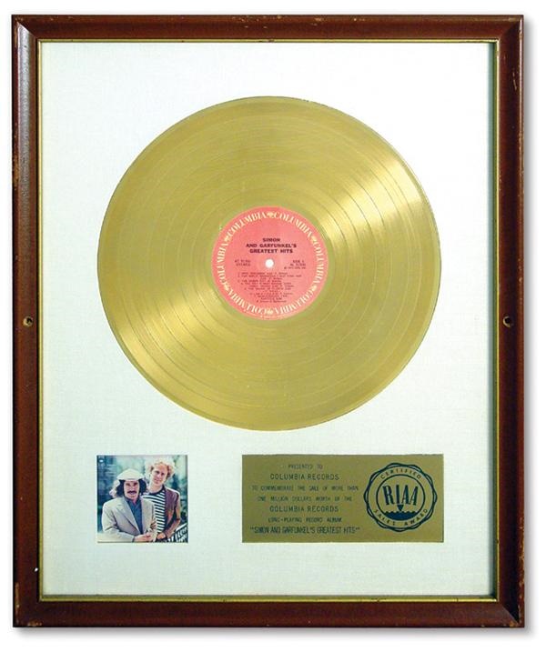 RIAA white matte certified gold record award for "Simon & Garfunkel's Greatest Hits". Presented to a Columbia Records executive "to commemorate the sale of more than one million dollars worth" of the 1972 released LP. Award is NRMT with some minor chipping to wooden frame and holes drilled on either side from being mounted.