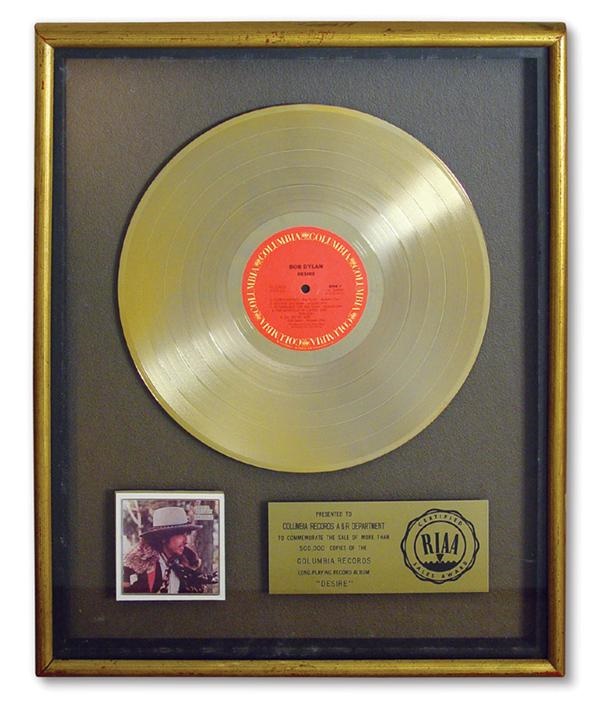 RIAA ceritifed gold record award presented to "Columbia Records A&R Department wo commemorate the sales of more than 500,000 copies" of Bob Dylan's 1976 released album, "Desire". Backing is taped, o/w EX. The record itself is pristine. Classic release featured the resurgent Dylan song Hurricane that spawned a new era for Dylan and a later major motion picture.