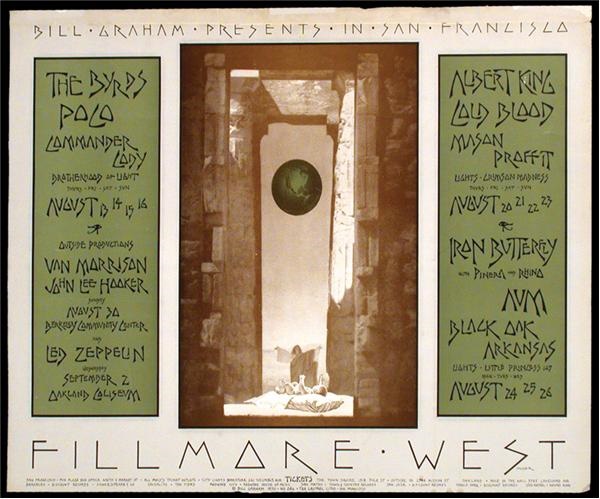 Bill Graham Presents poster for August 1970 promotes bands appearing at the Fillmore West and other San Francisco venues. Includes Led Zeppelin at the Oakland Coliseum and The Byrds, Van Morrison, John Lee Hooker, Black Oak Arkansas and others. This is a first printing of BG 246, measures 21x28”, VG-EX.