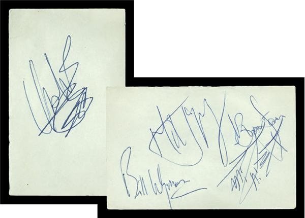 Five signatures on two pieces of paper. So rare to have the boys altogether especially with beautiful bad boy Brian. The important ones are all on one paper (sorry, Charlie don’t mean to be disrespectful). Both pages measure 2.75x4.5”. The first with Mick Jagger, Brian Jones, Keith Richards & Bill Wyman. The second is the same size and has Charlie Watts. Brian Jones and Keith Richards sigs inter-connect. Condition is EX+.