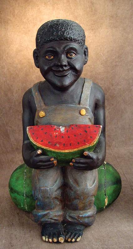 Adorable hand carved wooden figure is black boy sitting on a watermelon. Made in the 1950's, the piece is hand carved, covered with a special patina, then painted. The subject possesses a precious smile and holds a piece of watermelon in both hands with a bite mark out of it. In barefeet and overalls, he is just irresistable. A wonderful piece of Black Folk Art Americana. Some light foxing throughout. Some cracks on his back and arms, the watermelon on which he sits is badly cracked. Overall presentation is charming. Artist is unknown, but the initials, "P.W.G." carved onto the back of his shoulder. 17"wide and weighs 50lbs.