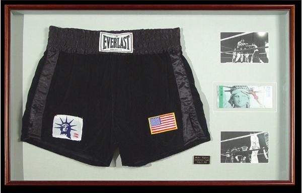 Black “Everlast” trunks with velvet finish and satin trim were worn by Iron Mike during an exhibition bout against Anthony Davis July 6, 1986. Staged in East Rutherford, New Jersey, the fight was part of the “Salute To The Statue” tribute show honoring the 100th Anniversary of Lady Liberty. Decorated accordingly the right leg has a blue and white Statue of Liberty patch with “1886, 1986” in red. On the opposite leg is an American flag patch with gold border. The trunks displaying obvious use were obtained from Tyson’s Assistant Manager at the time Steve Lott who from which the LOA comes. Mounted in a dark wood framed display measuring 24”x37” along with a ticket and photos of Tyson wearing these exact trunks.