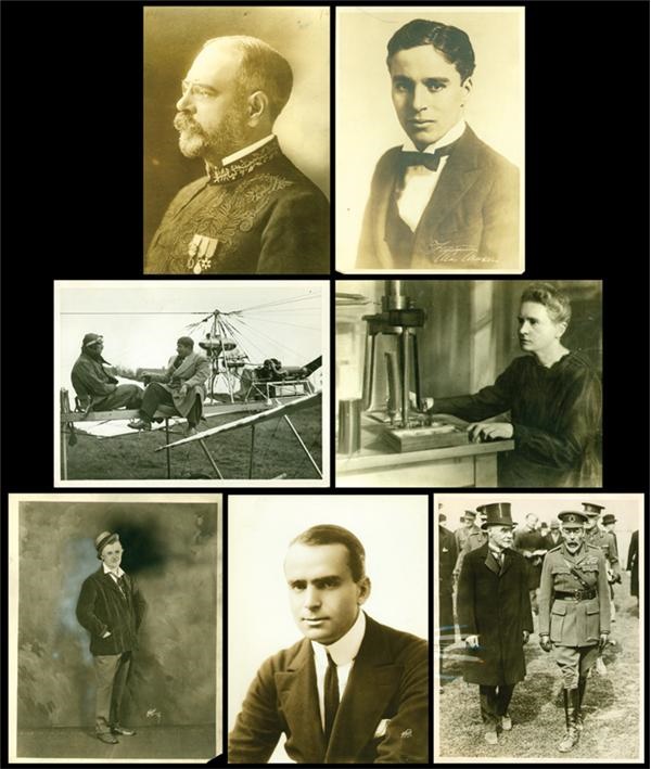 Marvelous collection is most interesting because it is so early and because it embraces so many desirable areas of popular culture. Most are literary, theatrical and vaudeville. Majority of the collection dates from the 1900s-20s with some 1930s stuff and just a small sampling beyond that point. It includes very early wire photos (mostly), plus studio portraits, stills, a few cabinets, some additional ephemera, and many are silver gelatin prints. Includes such important images of famous people such as Madame Curie (rare early wire photo), Rudyard Kipling (3, one with the King of England), early Ethel Barrymore (23), Theodore Dreiser (4), John Drew (2), A.E., Houseman (4), 1914 Victor Herbert, Hugh Walpole (3 with program), nice aviation file with Fokker (16), Henrik Ibsen with death photo (5), H.L. Mencken (3), 1930s Maude Adams (13), and many more. There is even a 1930s Hollywood file with movie stills, but mostly premiums. Well over 150 pieces. Overall EX.