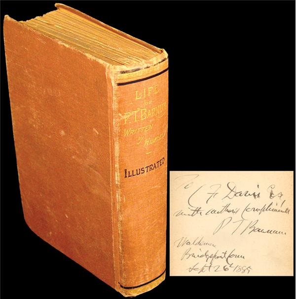 Autobiography signed by P.T. Barnum, the man who had the most influence on 19th Century America, the greatest showman ever. Endpaper of book is inscribed “To F. Davis Esq., with author’s compliments PT Barnum, Waldon’s Bridgeport Conn, Sept 26th, 1885”. This book was originally published in 1851 but was updated in 1885. Bridgeport is significant as he was mayor of the city and it was known as “the city that PT Barnum built”, eventually housing the P.T. Barnum Museum which exists today. Inscription is in black fountain pen and two letters are a bit smeared. Book is very good, binding is a bit loose, pages are tanned.