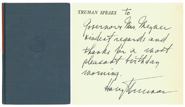 Originally presented as a gift to the Governor of New Jersey, Robert B. Meyner, the NRMT dark black ink the inscription reads, “To Governor & Mrs. Meyner, Kindest Regards and thanks for a most pleasant birthday morning. Harry Truman. Essentially the short book is a transcript of Truman’s April 27th-29th 1959 lectures at Columbia during which he discussed the federal government. Published by the Oxford University Press and copyrighted in 1960. The EX book Measures 5.5”x8”.