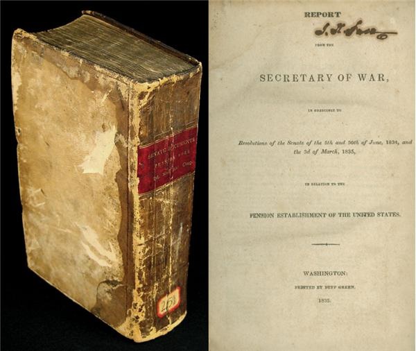 Book is a list of Senate Documents entitled Senate Documents - Pension Roll - 1st. Sess. 23d. Cong. Signed by our 11th president, responsible for much of America's westward expansion. Black fountain pen signature on the title page, "J.K. Polk" is considerably bled, and has left a mark on four of the adjacent pages. Hardcover book is VG. Copyright 1835.