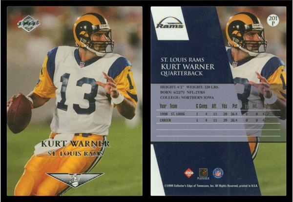 Kurt Warner’s Collectors Edge limited edition rookie card, was a last minute addition to the print run that few collectors knew of. In order to promote its late release, Collector’s Edge issued a number of those same cards without the hand-written registration numbers to be distributed. Offered are 1,000 of those glossy specimens, each in NM-MT to Mint condition. Each one is numbered 201P. As one would expect the color, clarity, and corners are superb and their potential is just as great.