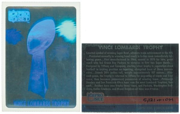 Known to collectors as the first official insert card ever, this alluring piece from Pro Set blazed a trail in the industry that would soon be followed by all others. On the front, bursting fireworks surround an image of the coveted award above the title, “Vince Lombardi Trophy”, while on the glossy, metallic verso is a brief history of the hardware. Only ten thousand of these dazzling holograms were issued, each numbered by hand in black sharpie. This is an opportunity to own a significant piece of the entire standard setting run.