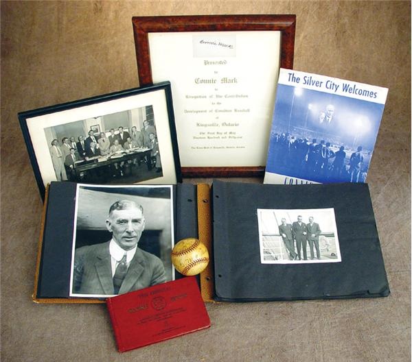 Silly for Ol’ Philly? Well, we have just the antidote: 1) Perfectly preserved under a fine layer of shellac, on this Reach Official League ball, is the large 7/10 black ink signature of Connie Mack. 2) Late 1920’s Philadelphia A's painted cloth covered, “Official Score Book” from Reach. Several scored pages include the likes of Grove, Cochrane, and Simmons. EX. 3) 8x10 photo of Mack surrounded by his former superstars. NRMT. Matted and framed to 10.5”x12.5”. 4) 9x12 blue and white “Roger Bros. 100th Anniversary” handbill featuring Mack. EX. 5) “1929 World Series Scrapbook” includes various photos, newspaper and magazine clippings, and scorer’s sheets. EX. This was presented to Connie Mack by his fans. 6) 11”x14” certificate presented to Connie for “His Contribution to the Development of Canadian Baseball”, includes his 8/10 black fountain pen signature. Framed to 13”x16”. EX.