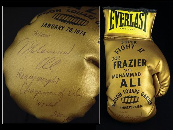 Rare golden Everlast glove was originally distributed in very limited numbers to promote this epic bout. Bold block letters advertise, “Superfight II Joe Frazier vs. Muhammad Ali Madison Square Garden January 28, 1974.” Signed below is, “From, Muhammad Ali Heavyweight Champion of the World Dec 1974” in black sharpie. NRMT. Irresistible to any boxing enthusiast.