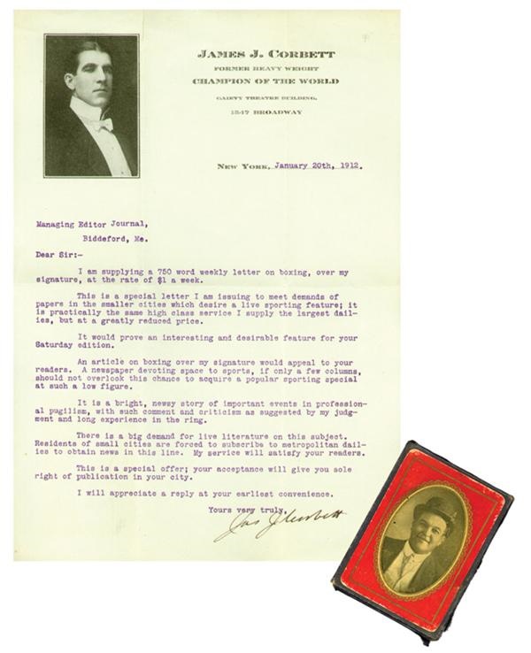 Letter addressed to the Managing Editor Journal in Biddeford, ME. with regards to a weekly letter on boxing which he was offering to get published: "Dear Sir: I am supplying a 750 word weekly letter on boxing, over my signature, at the rate of $1 a week. This is a special letter I am issuing to meet demands of papers in the smaller cities which desire a live sporting feature; it is practically the same high class service I supply the largest dailies, but at a greatly reduced price…" Signed in black fountain pen. Signature grades a 9.5 out of a possible 10. Letter is EX with original folds. Dated Jan. 1912 on James J. Corbett letterhead with printed portrait in corner. Included is a set of playing cards printed with James Jeffries on the backs and different photos of fighters on the fronts. EX in original box.