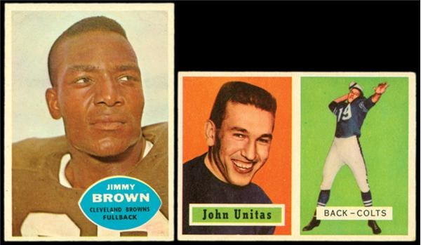 A 1957 Topps Johnny Unitas Rookie (EX+), a 1960 Topps Unitas (EX) and Jimmy Brown (EX-MT) lead the collection. There is (11) other '57 Topps football, (53) other '60 Topps football, (18) '59 Topps, and (10) 1960 Fleer. Other '57s include Dick Lane's rookie (EX) and Groza (EX). Other 1960 Topps include Hornung (EX-MT), Layne (EX), Bednarick (EX-MT), and L. Moore (EX). The 1960 Topps average EX to EX-MT. Other highlights include '59 Topps Karras' rookie (VG), Huff rookie, and Jim Taylor's rookie (EX).