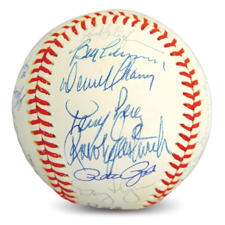 One of the finer representations of the World Champion Cincinnati Reds of 1975. ONL (Feeney) ball is covered with 27 total ink signatures (ranging from 7-10/10) including World Series MVP Rose, along with Bench, Perez, Concepcion, Morgan, Foster & Kluszewski on the sweet spot. Ball is in NRMT condition with the slightest hint of off-white toning.