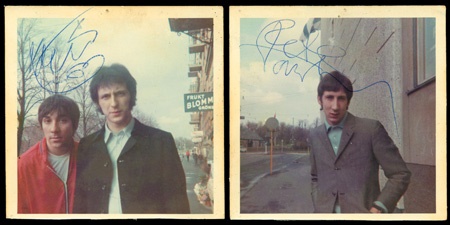 Candid color snapshots of Keith and Peter were snapped in Sweden in 1967 by a local young and appreciative female fan. They were later signed in autumn of ‘69 on the streets of Manhattan when this girl and her U.S. friend saw them in front of the Hilton on 57th Street (Moon's antics had already gotten them banned from the Holiday Inn) before a concert at the Fillmore East. Photos are EX, gorgeous vintage signatures are in mint blue ink. LOA from the U.S. girl (now a grown woman with children) who obtained the signatures in person.