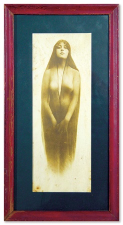 Famous photo taken in Tombstone, Arizona of Josephine Sarah Marcus Earp, with little of her beautiful 19-year-old body hidden from the camera. Picture dorns the cover of her autobiography I Married Wyatt Earp. She was actually a Jewish girl from Brooklyn. For forty-seven years, they roamed the West, mingling with well-known westerners on both sides of the law. Photo is framed and matted measures 6x16”, has some foxing, could use a cleaning. But the clarity is simply amazing.