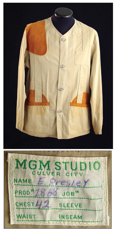 Jacket worn by Elvis in Viva Las Vegas, consigned by a member of the “Memphis Mafia” and one of Elvis Presley’s closest friends, Lamar Fike. Viva Las Vegas was released by MGM in 1964 and became one of Elvis’ most popular films. Jacket has an MGM Studio silk embroidered label which reads “Elvis Presley Prod. 1868 Chest 42”. Beautifully made of Khaki summer weight cotton with kid leather patches. LOA from Lamar Fike explains the origins of the jacket, includes pictures of Elvis wearing the jacket, & describes his relationship to Elvis with photos documenting that relationship.