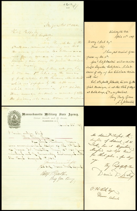 An amazing collection of hand written correspondence from military Generals and Admirals relating to pre and post Civil War. Includes Lieutenant General William Joseph Hardee - dated 1865, Admiral David Dixon Porter (2) - one is dated 1874, General Benjamin Butler of the Massachusetts military - written on "Massachesetts Military State Agency" letterhead and dated 1867, Confederate General Joseph Eggleston Johnston (2) - dated 1887 & 1888, General Daniel Edgar Sickles - dated 1842, & more. Paper size from 5x8" note paper to 8.5x11", some on official letterhead or documents. All written in black fountain pen and signatures grade exceptionally well, some are perfect. EX.