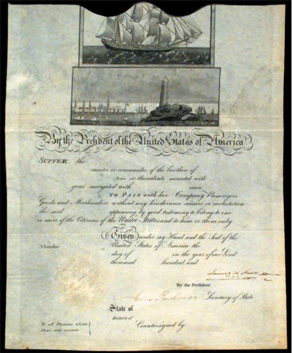 Great document signed by President James Polk and Secretary of State, James Buchanan in black fountain pen. Slightly faded but continuous and nicely legible, signatures grade as 7's out of a possible 10. Americana graphics of a ship and a light house printed on paper. Original folds, original seal has been removed or has fallen off. Some wrinkling. VG-EX.