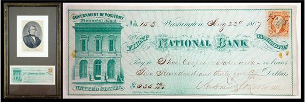 Our seventeenth President, and the unfortunate successor to Abraham Lincoln, has left his 7/10 fountain pen signature at the bottom this check issued by the Government Depository and Financial Agent. Dated August 23rd 1869 it has been made out to one “Thas Cooker” in the amount of “$235.12”. Slightly trimmed along the bottom edge with official stamping on verso that crosses the signature o/w EX. Matted and framed with a 4.5”x6.5” image of Johnson to 11”x19”.
