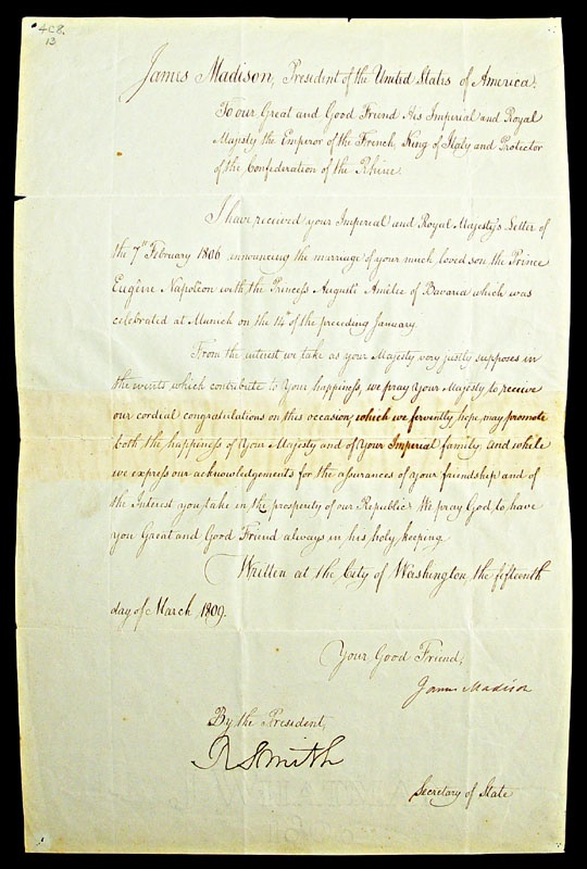 A marvelous and fascinating document is this hand written letter to Napoleon, signed by the fourth U.S. President, James Madison. Napoleon is formally addressed and the letter is signed, "Your good friend, James Madison." The signature itself grades a 9.5/10. Letter is elegantly inked completely in black fountain pen and serves to congratulate the Emperor on his son's wedding: "To our great and food friend His Imperial and Royal Majesty the Emporer of the French, King of Italy and Protector of the Confederation of the Rhine. I have received your Imperial and Royal Majesty's Letter announcing the marriage of your much loved son the Prince Eugene Napoleon with the Princess Auguste Amelie of Bavaria which was celebrated at Munich on the 14th of the preceding January. From the interest we take as your Majesty very justly supposes in the events which contribute to your happiness, we pray your Majesty to receive our cordial congratulations on this occasion…" Dated March 15, 1809. Original folds, restored horizontally in the middle. VG.