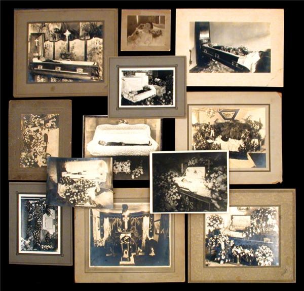 Collection of 34 mostly large photos (largest is 12x19.5”) is hand colored of a stricken couple with a dead baby. Some are babies and children and some are adults. The deceased was often laid out in a casket in the parlor at home. The photographer was commissioned to capture a portrait of someone who would be missed; the image was considered a keepsake, not a morbid reminder of mortality. The photos are from 1890s to 1941 although the majority are 1900 thru 1920. They are in mattes originating from all over the country (Maryland, Delaware, Illinois, Montana, Wisconsin, New Jersey, Montreal, Minnesota). Some are in coffins and some are propped up to look like they are sleeping. Condition overall is EX.