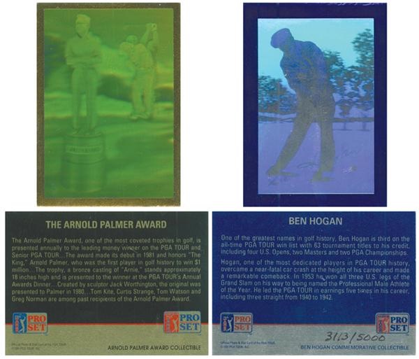 These were inserted in to Pro Set golf at a rate of one per case. A pair of the greatest golfers of all-time showed here on unique and tough to find insert holograms. Fifty each of the 1991 Pro Set Arnold Palmer Holograms and 1992 Pro Set Ben Hogan Holograms numbered to 5,000. Cards average EX-MT to NRMT.