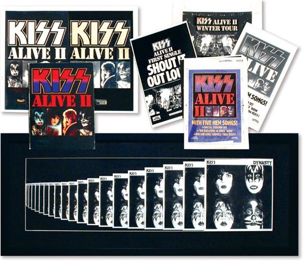 Killer stuff here: 1) Nine original art for ads (Billboard, etc.) for KISS Alive II. 11x14” and larger on heavy cardboard, four advertise “Shout It Out Loud!” Best is a full color with color separations. 2) Original art for a 12x36” promotional poster for KISS Alive II. 3) “KISS Alive II Is Coming” ad original art with three 8x10” original photographic negatives (nice!) and some great extras including original envelope. 4) Back cover advertising original art for the KISS Alive II Winter Tour. Even shows all the dates. 12x15”. 5) KISS Alive II original art is 16x19” cardboard matte. Was done for some unknown but important purposes based on the look. 6) Original mounted T-Shirt on board for KISS Alive II was done for a corporate presentation. 7) 15 photos, stats, and one original copy negative including the earliest promo still we have ever seen with the old make-up. 8) 1979 Madison Square Garden poster original art for the Dynasty tour. Beautifully framed piece shows the simple image of multiple band images before the wording was added. Verso has attached tissue overlay original sketch with how the wording should appear. Collection is overall VG.