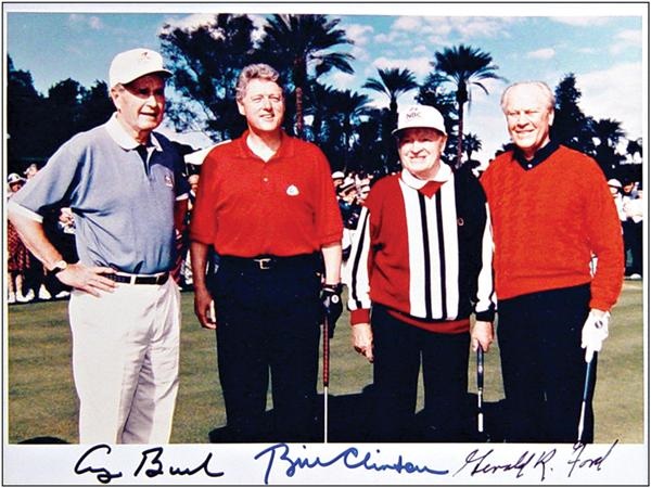 Full color glossy photo of George Bush Sr., Bill Clinton, Gerald Ford & Bob Hope enjoying a fine day on the green. Signed underneath photo by Bush, Clinton & Ford. NRMT to Mint. Professionally matted and framed to 15x17".