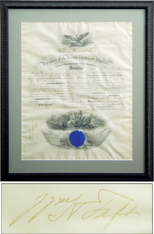 Official document dated April 13, 1911 is partially printed, and signed, "Wm. H. Taft" in thick black fountain pen (signature is faded to light brown). Originally served to appoint Isaac Reeves as Commodore in the Navy on the Retired List. Additionally signed by the Secretary of the Navy. Blue seal of the War Department at bottom center. Some light foxing and creasing, o/w EX. Framed to 21x25".