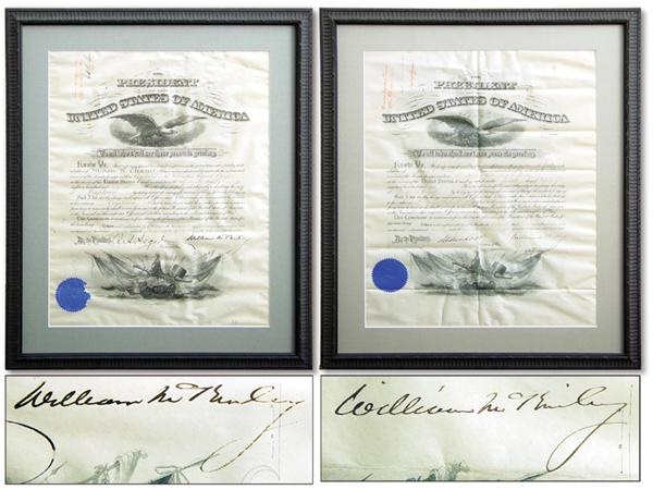 1899 & 1901 signed documents on "The President of the United States of America" official document paper (16x20"). The first is for the appointment of John F. Stretch to the position of Lieutenant Colonel of Infantry. Original folds, some foxing and creasing. VG. The second is for the appointment of William W. Chance to the position of Captain in the Volunteer Signed Corps. Light foxing, VG-EX. McKinley's black fountain pen signatures grade 7-8/10. Each document contersigned by Secretary of War & the Adjutant General. Both bear a blue U.S. War Department seal at lower left. Framed to 21x25".