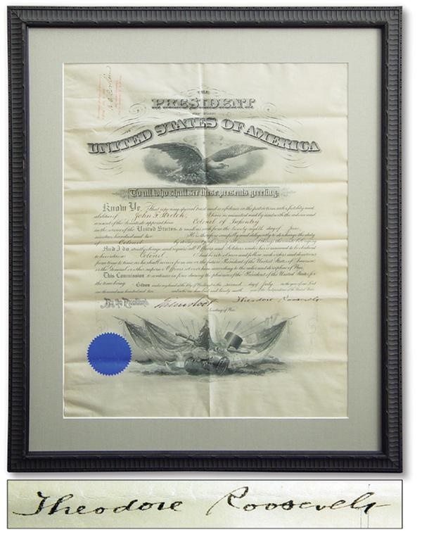 Official Document dated July 2, 1902 is signed by Theodore Roosevelt in black fountain pen. Originally served to appoint John F. Stretch to the position of Colonel of Infantry. Signature is slightly bled, but bold and dark. Document with blue War Department seal in lower left is countersigned by Secretary of War and the Adjutant General. Original folds and some light creasing. O/w EX. Framed to 21x24.5".