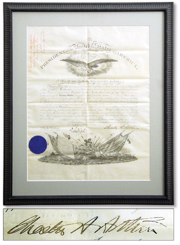 Incredible official document is dated December 26, 1884, signed by Chester A. Arthur in a bold black fountain pen. Signature is large and thick, but faded to a light brown with some ink loss to the end of last name. Originally served to appoint John F. Stretch to the position of Captain in the Tenth Regiment of Infantry. Blue seal from the War Department in lower left. Original folds, some light foxing and creasing, very light toning and the Americana graphics at top and bottom have faded ever so slightly. VG-EX. Framed to 21x25".