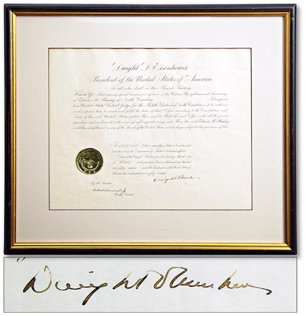 Signed 1957 document for the appointment of Edwin M. Stanley of North Carolina as a U.S. District Judge. Bears the gold Department of Justice seal in lower left and black fountain pen signature, grading a 7 out of a possible 10. Document itself is NRMT. Framed to 22x26".