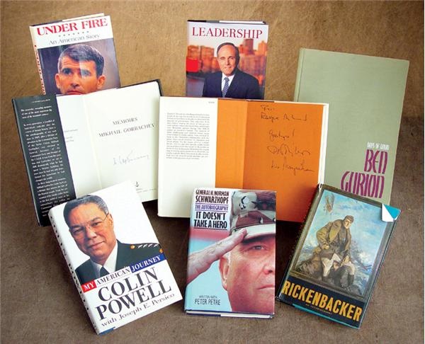 Collection of 19 signed biographies, memoirs & autobiographies by world leaders including Henry Kissinger "Years of Renewal", Colin Powell "My American Journey" (2), Mikhail Gorbachev Memoirs, Oliver North "Under Fire", General Norman Schwarzkopf autobiography, Rudy Giuliani, Arthur Schlesinger, Jr., Margaret Thatcher, & more. Books range from EX to NRMT to Mint. Signatures are all high-quality with the majority grading "10". Mostly hardcovers.