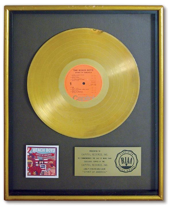 RIAA ceritfied gold record award for the Beach Boys 1975 release, "Spirit of America". Presented to "Capitol Records, Inc. to commemorate the sale of more than 500,000 copies" of the early Beach Boys record. Excellent condition.