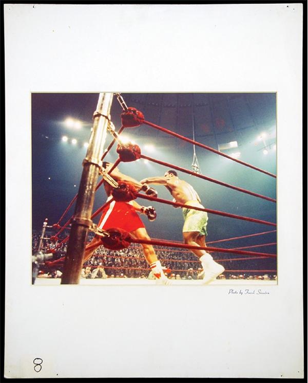 In 1971, Life Magazine commissioned Old Blue Eyes to photograph the now legendary Ali-Frazier 1 bout. From his ringside seat he was able to capture remarkable images that are without equal. In this photo Smokin’ Joe lands a stinging left hook, one of many Ali would endure that day. Matted to 16”x20” and stamped with the notation “Photo by Frank Sinatra”. Marked with a black “8” in the lower left corner. After the photo was printed and displayed by Life, Frank gave it to his best friend Jilly Rizzo where it hung in his infamous NY establishment, Jilly’s Restaurant, until now. Photo is NRMT. LOA.