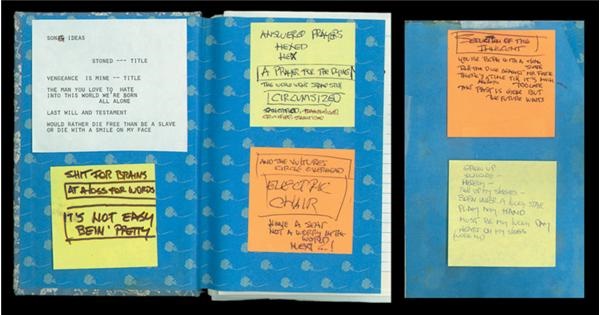 This powder blue cloth cover book (8"x5.5") with white floral designs is not where you would expect a creature of the night to pen his darkest thoughts. As they say though, you can't judge a book by it's cover. Inside on the seperated sheets, Gene's hand written, sometimes typed, lyrics and reminders fill the pages alongside random post-its and hotel letterhead containing additional thoughts and ideas. Samples from Simmons include: "I Have No Mouth And I Must Scream", "Have you ever tried so hard that your world fell apart?", "Don't Feed The Animals", unfinished lyrics for "It's Not Easy Bein' Pretty" and "Old Enough To Kill". A rare look into the mind behind the make-up.