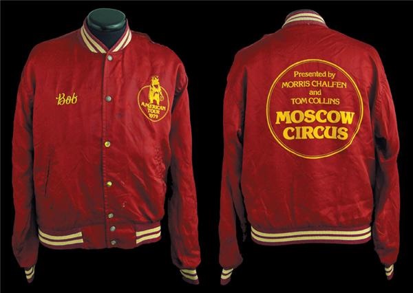 This jacket was the legendary Bob Dylan's windbreaker on tour in 1979. "Bob" embroidered on right breast in yellow thread. Left breast bears the silkscreened "American Tour 1979" emblem. On the verso reads, "Presented by Morris Chalfen and Tom Collins - Moscow Circus." Jacket is worn along the left shoulder seam and shows signs of heavy use. Front is stained. Originally came directly from Diaz, the ultimate source for all good Dylan memorabilia.