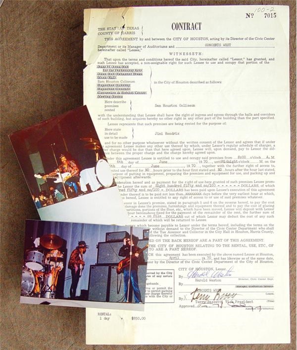 Signed contract (8.5”x14”) for the use of “Sam Houston Coliseum” for Jimi’s June 6th, 1970 performance in Houston, TX. Torn 1.5” along centerfold, some paper loss, pencil markings, and light discoloration 1.5” along left border. VG-EX. Fifty 3.5”x5”, high quality snapshots in color and B&W taken during various Hendrix performances. Great content. Overall NRMT condition.
