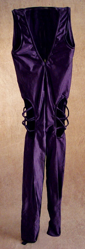 Now you can step into Gene's clothes with this body suit that he wore on stage during KISS' 1996-97 concert tours. From his private collection, and so distinctively Gene, with trademark cut out sides with laces. Stirrups at bottom of pant legs. NRMT condition.