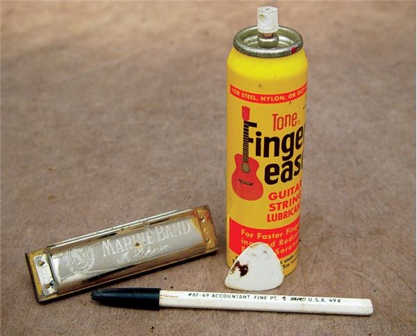 Good things come in small packages, especially this one. Inside you'll find an assortment of items used during one of The Boss' most memorable performances. 1) Silver "Marine Band" Hohner model harmonica which displays great use. 2) A white "Fender" guitar pick used by Bruce. 3) 4oz can of "Finger-ease" guitar string lubricant. 4) White "Bic #AF-49 Accountant Fine Pt" pen with teeth marks. Obtained from long-time close friend and employee of Bruce Sprinsteen, an impeccable source. Obtained doirectly from person who worked for Bruce and the band and is as close as you can get.