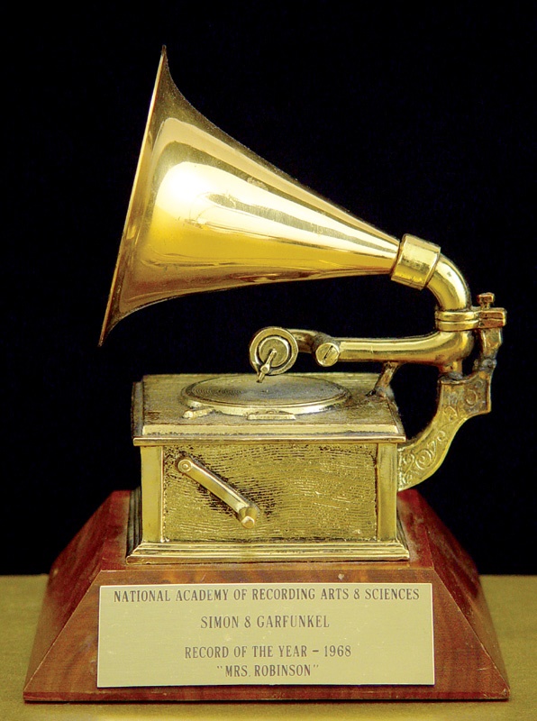 By far the most coveted award in the music industry, and one of the most desired collectible prizes. This is probably the most important, defining piece of Simon and Garfunkel’s career, this 1968 Grammy award is sure to be the crowning jewel of any serious rock and roll collection. Gold phonograph atop wooden stand with gold engraved plate: “National Academy of Recording Arts & Sciences Simon & Garfunkel Record of the Year - 1968 “Mrs. Robinson.” EX-MT condition. Stands approx. 7” tall.